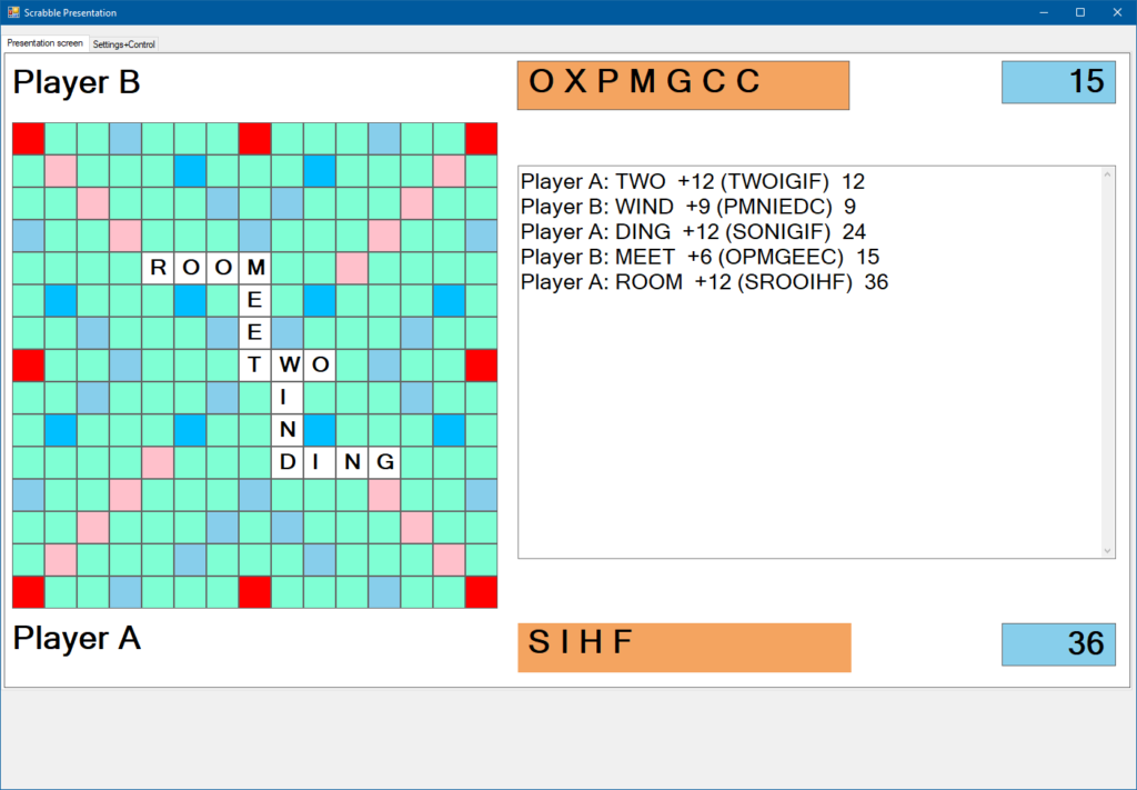 The Windows application receives the information from the board, and processes it, generating a presentation screen, showing placed words, detecting turn change and calculating total scores. An event name and the players’ names can be entered before.